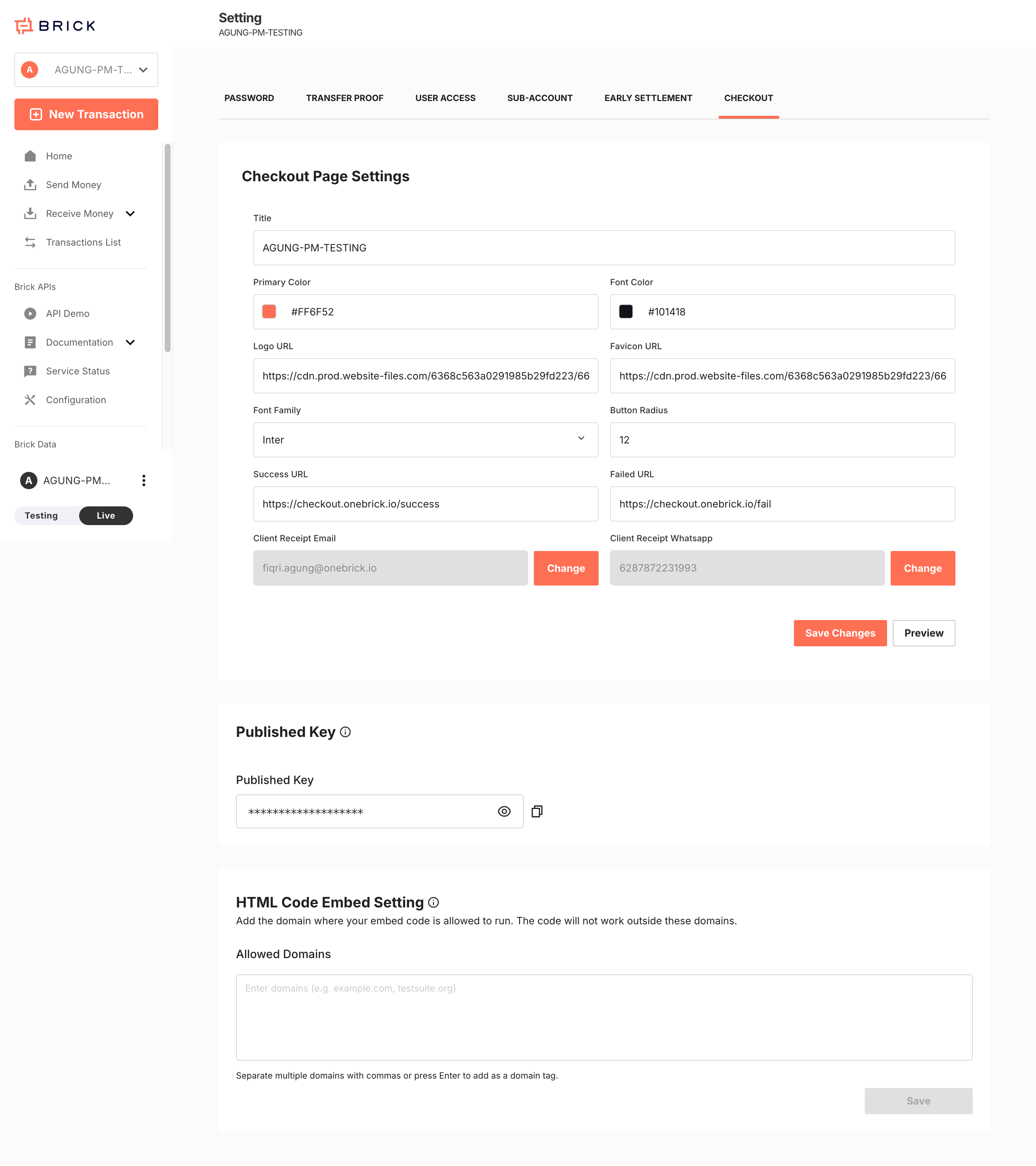 Open the Brick Dashboard and navigate to Settings > Checkout