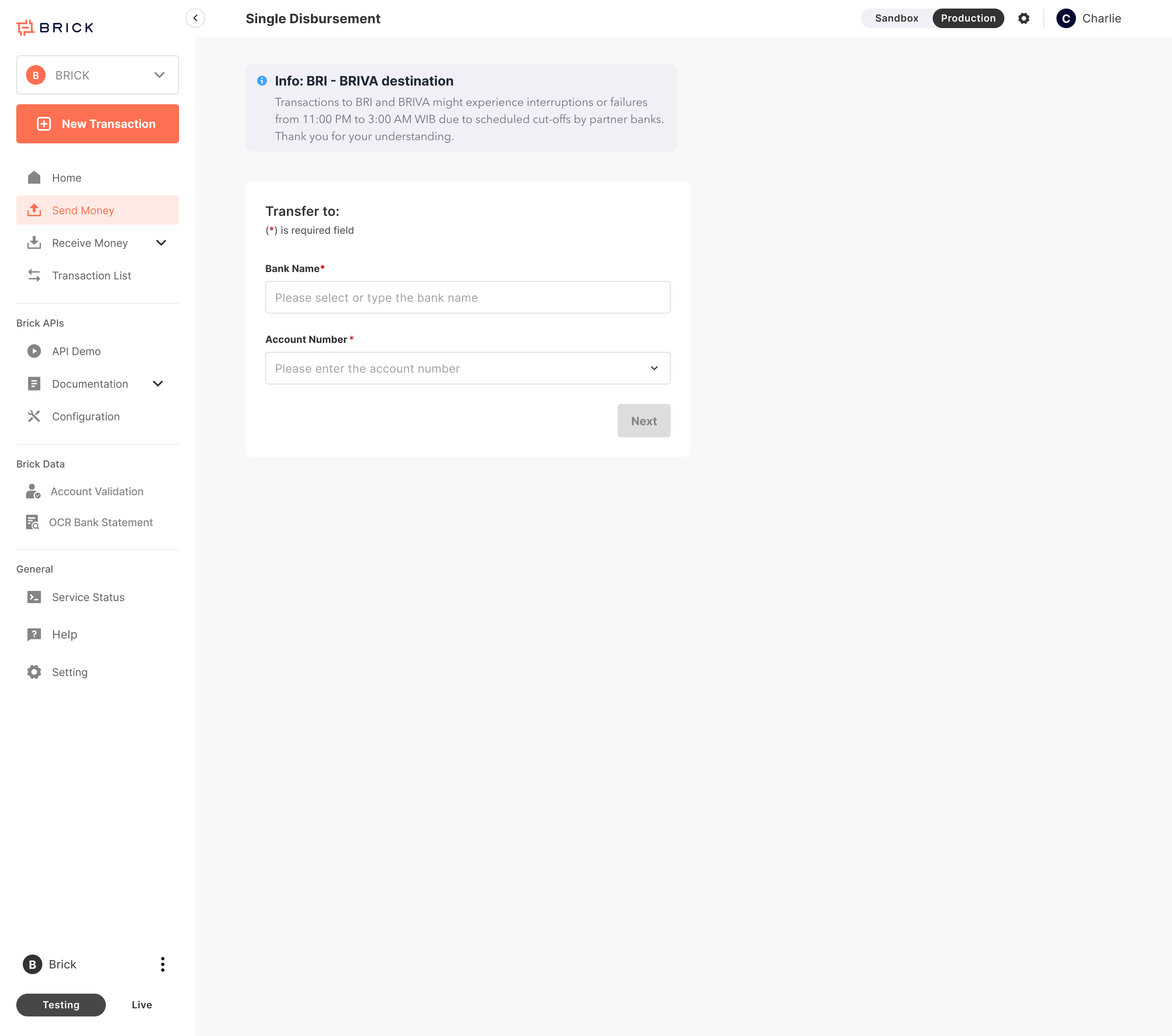 The system automatically validates account details and performs a cut-off time check to ensure alignment with partner bank windows. If validation fails, an error message will prompt you to correct the information before proceeding.