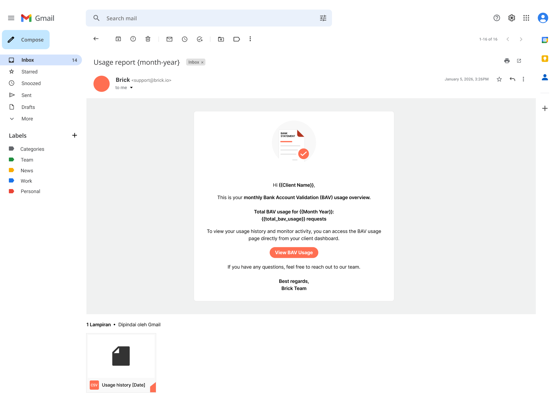 Monthly Account Validation usage reports are emailed on the 5th at 8:00 AM to the registered Brick account email.